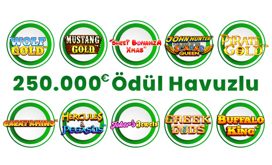 - 1. haftada Wolf Gold, Mustang Gold, Sweet Bonanza Xmas, John Hunter Scarab Queen, Pirate Gold, Great Rhino, Hercules and Pegasus, Joker Jewels, Greek Gods, Buffalo King ve Magic Journey oyunlarında; 2. haftada Wolf Gold, Mustang Gold, Sweet Bonanza Xmas, John Hunter Scarab Queen, Pirate Gold, Great Rhino, Hercules and Pegasus, Joker Jewels, Greek Gods, Buffalo King ve Money Mouse oyunlarında; 3. ve 4. haftada Wolf Gold, Mustang Gold, Sweet Bonanza Xmas, John Hunter Scarab Queen, Pirate Gold, Great Rhino, Hercules and Pegasus, Joker Jewels, Greek Gods, Buffalo King ve Release the Kraken oyunlarında oynamanız gerekmektedir.
